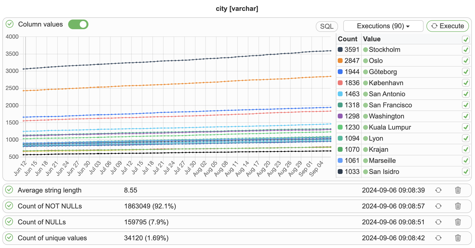 Data profiling provides deep insights into your data by offering a comprehensive column-level overview of available values and their distribution. With this feature, users can quickly access aggregated metrics such as the count of empty and non-empty values, the number of unique values, and statistical measures like minimum, maximum, and average values. These insights allow you to understand the structure, completeness, and variability of your data, helping to identify any inconsistencies or potential issues.