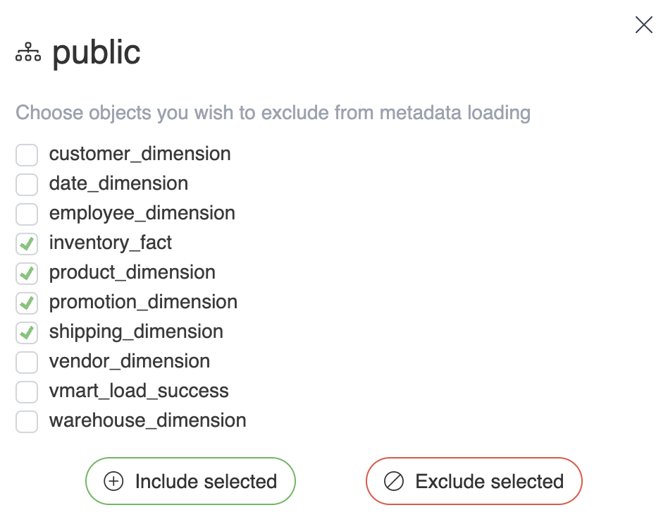 Choose all objects you wish to Exclude/Include (You can use Shift+Click to choose multiple checkboxes) NB! When you re-include an excluded object, metadata will be loaded again for given schema