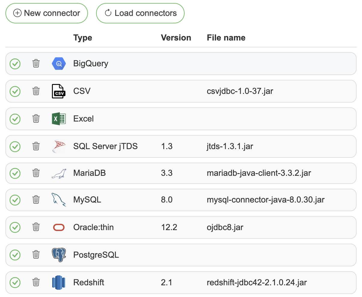 Connectors are essential part for connecting with various datasources. All connectors are JDBC based, except REST, CSV and Excel connectors.