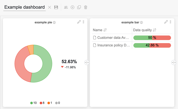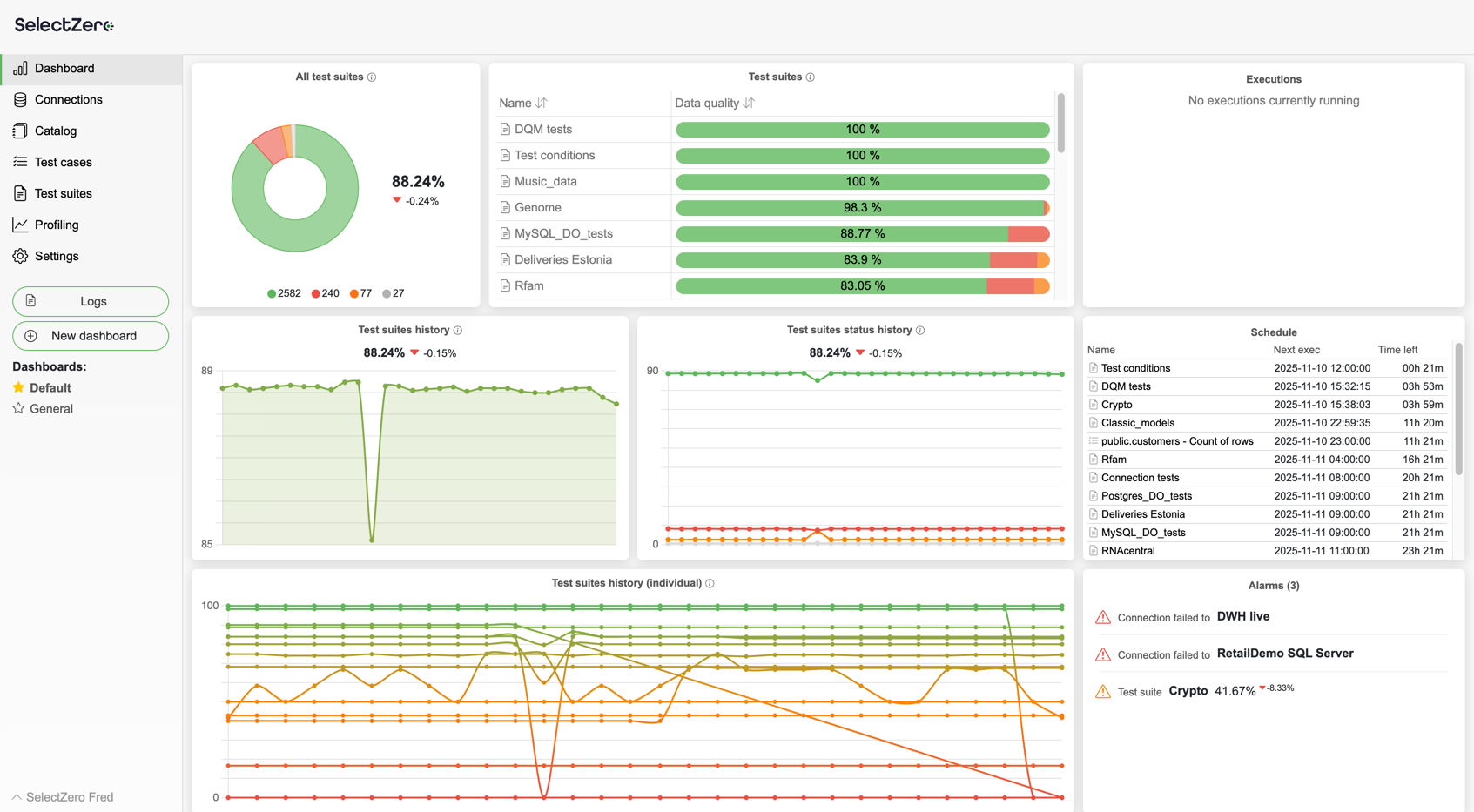 Dashboard gives an overview of current data quality based on the validations inserted into the application. It shows status-based charts for selected test suites, business rules, test case reports, objects, schedule, information about ongoing and upcoming executions, alarms, and logs.