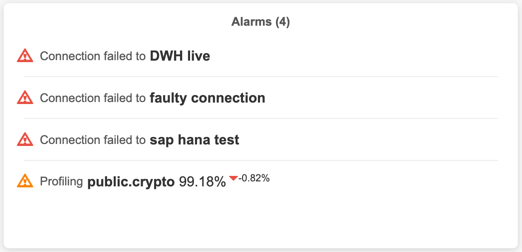 Alarms are created for failed connections, and for test suite or profilings which results/statuses have negatively changed compared to previous day.