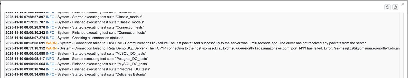 Logs can be refreshed by clicking on the Refresh icon. Detailed history view of logs can be opened by clicking on the List icon