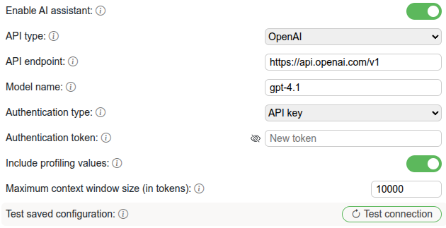 API endpoint – AI assistant API endpoint. Local models are supported as well if you have them made available via an API. Example endpoint configurations (can vary depending on how your IT department makes the services accessible):