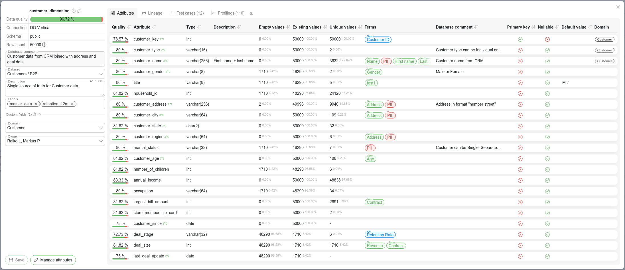 Clicking on an object name opens a detailed view, allowing users to get insights on attribute level. Users can view metadata and metrics, add comments, and manage related business terms from Glossary.