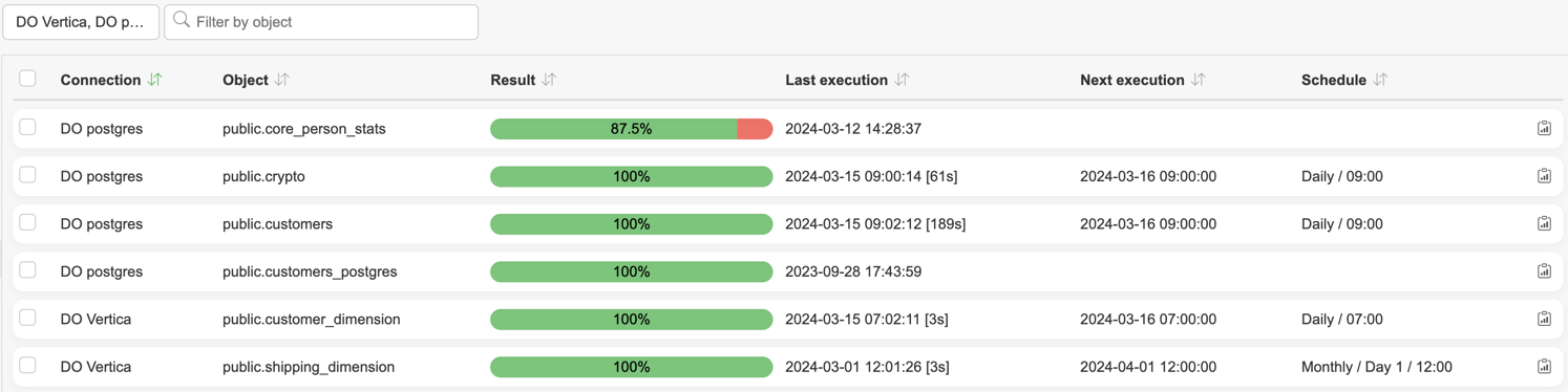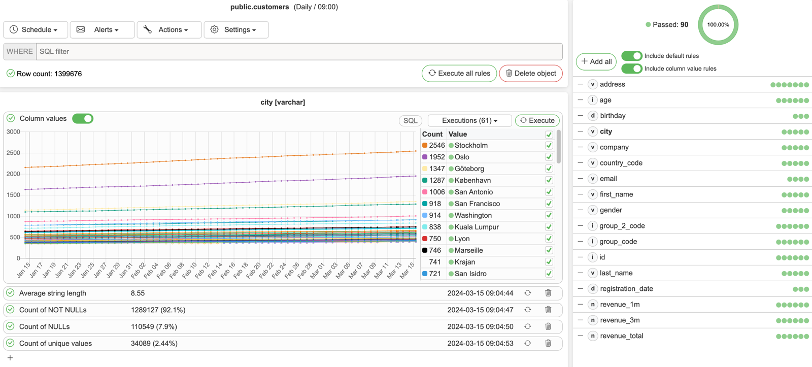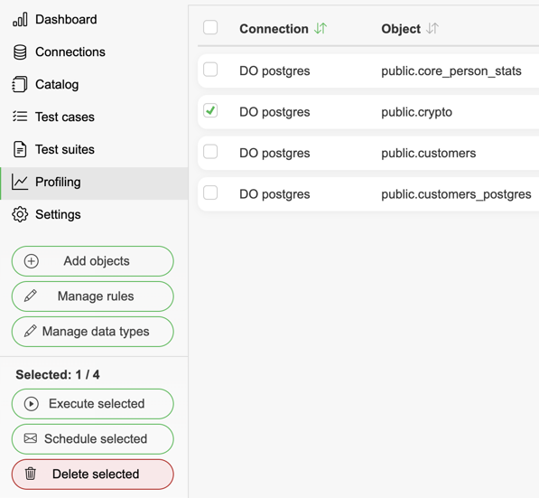 Profiling page allows users to set profiling rules for selected objects and columns. This allows users to get insights on what kind of data is available, how the data is changing over time, and detect anomalies and deviations in data.