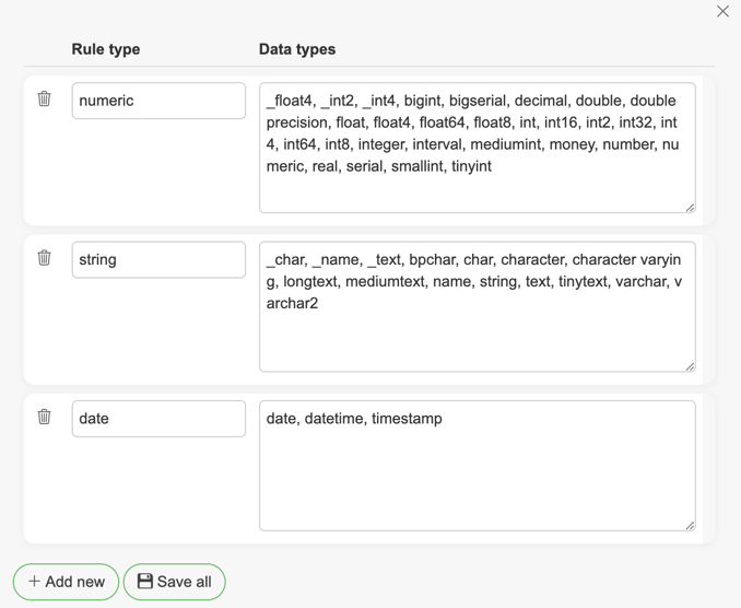 Data types for rules can be added/removed/changed by clicking on "Manage data types" button from sidebar. Rule types categorize which rule can be created/assigned for a column based on its data type. Data types with parentheses must be inserted without the parentheses (e.g. VARCHAR(150) as VARCHAR).