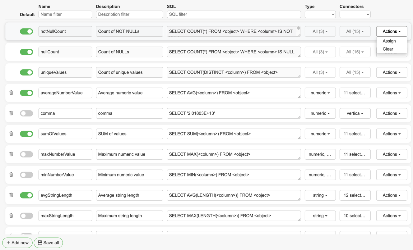 A rule can be assigned to all applicable columns by clicking the "Actions" button and then selecting "Assign" for the selected rule. The option "Clear" will remove rule from all columns that are no longer applicable by data type or driver/connector.
