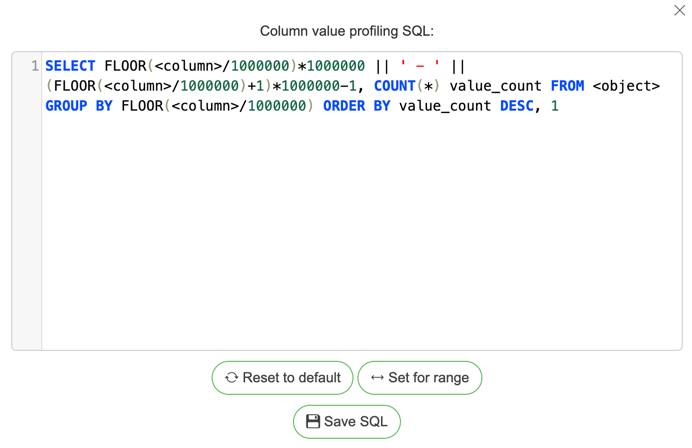 By default, column values are analyzed by finding counts for each value. It is possible to change the SQL used to get column value results by clicking “SQL” button: