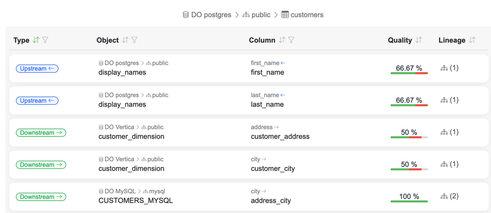 At the top of the modal a breadcrumb shows the object path (connection › schema › object). Clicking it opens the catalog object's Lineage in a new tab.