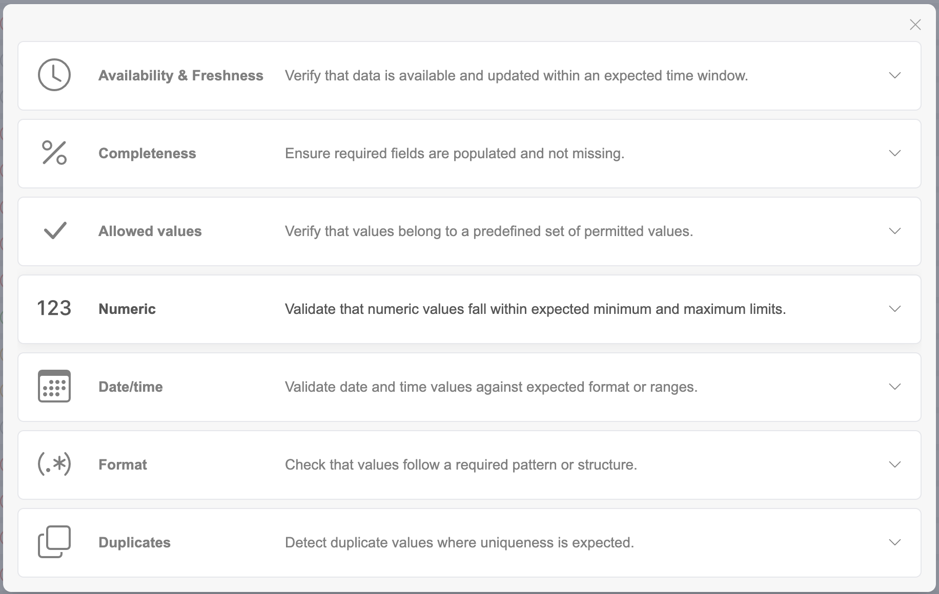 Choose from the available validation types presented as large icons in the modal