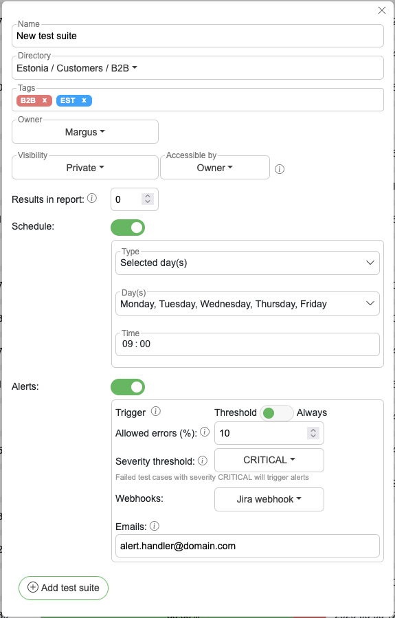 Allowed errors – % value of errors allowed. When the test failure percentage is larger than the allowed threshold, an alert will be sent (0% to send an alert if any of the tests fails)
