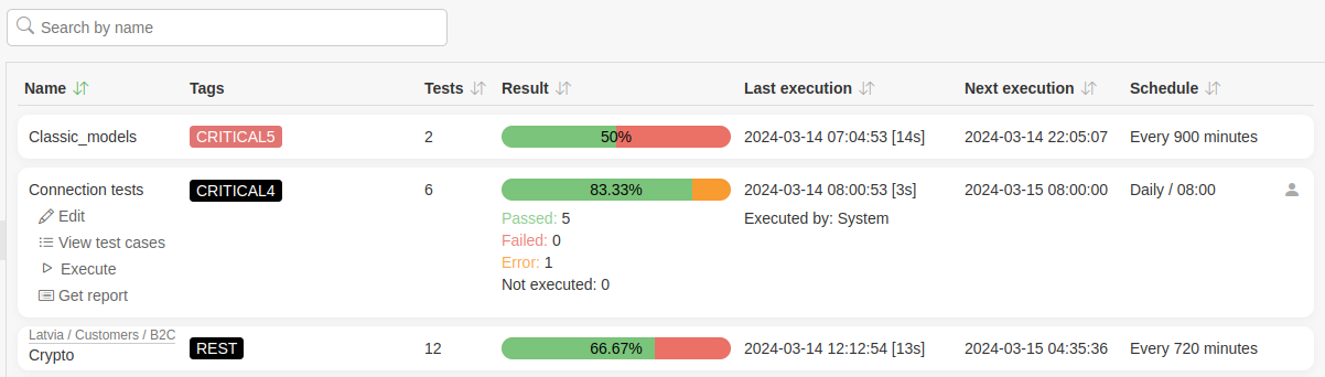 Execute – execute the test suite (requires user to have access to all test suite's test cases' connections)