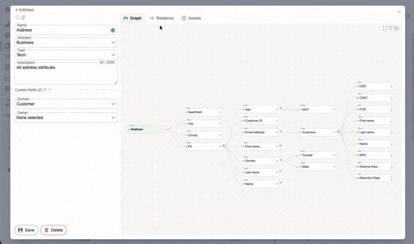 The Glossary term detail view has been redesigned with dedicated tabs for Graph, Relations, and Assets, making it easier to explore and manage term context. The legacy view has been unified with the Catalog layout, enabling a side-by-side experience with configurable panel widths that are saved per user for a more personalized workflow.